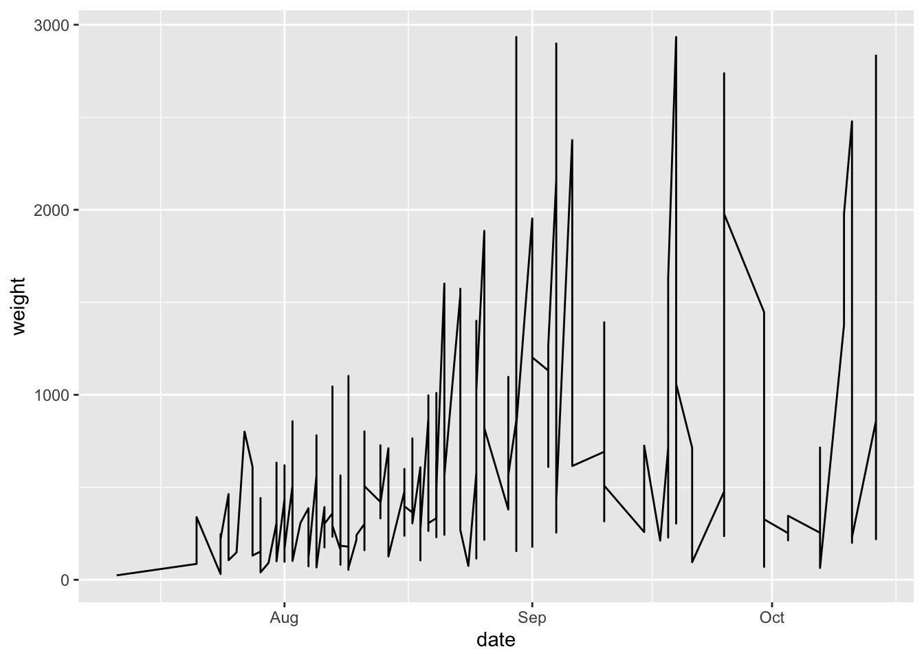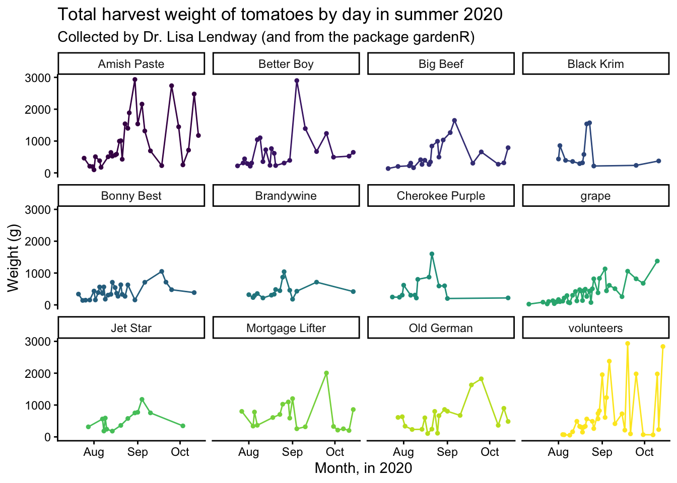 You can see that what R has done is take each date, and plotted the total weight of tomatoes harvested on that day. What we can see from this part is that in the beginning of the season, there is little tomato production (this is not surprising to anyone who knows about horticulture or has grown tomatoes before), and production increases as the season progresses. We donât see any harvest after mid-October which makes sense because Dr. Lendway lives in Minnesota and probably there was a frost that killed the plants (hence no more đ ).