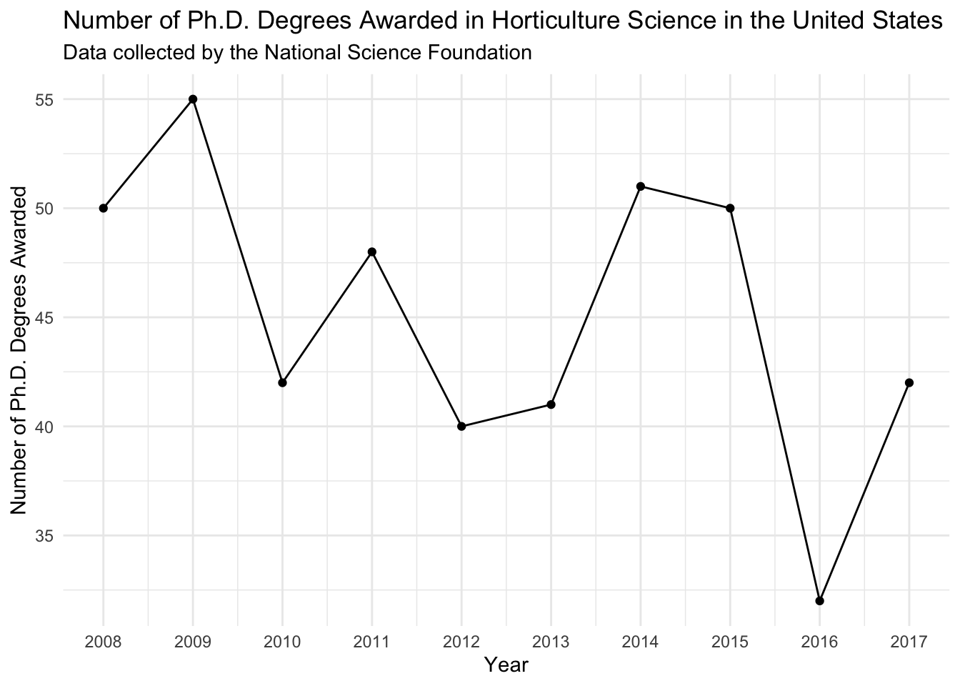 title = "Number of Ph.D. Degrees Awarded in Horticulture Science in the United States",