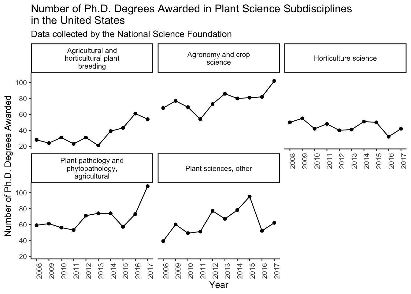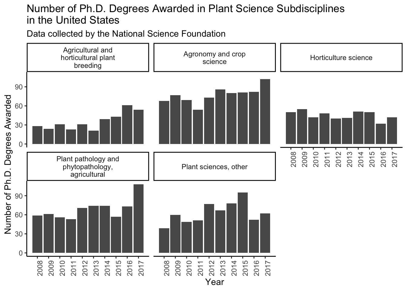 title = "Number of Ph.D. Degrees Awarded in Plant Science Subdisciplines \nin the United States",