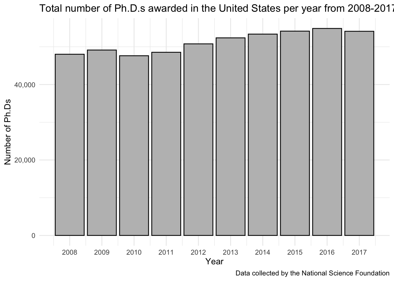 title = "Total number of Ph.D.s awarded in the United States per year from 2008-2017",