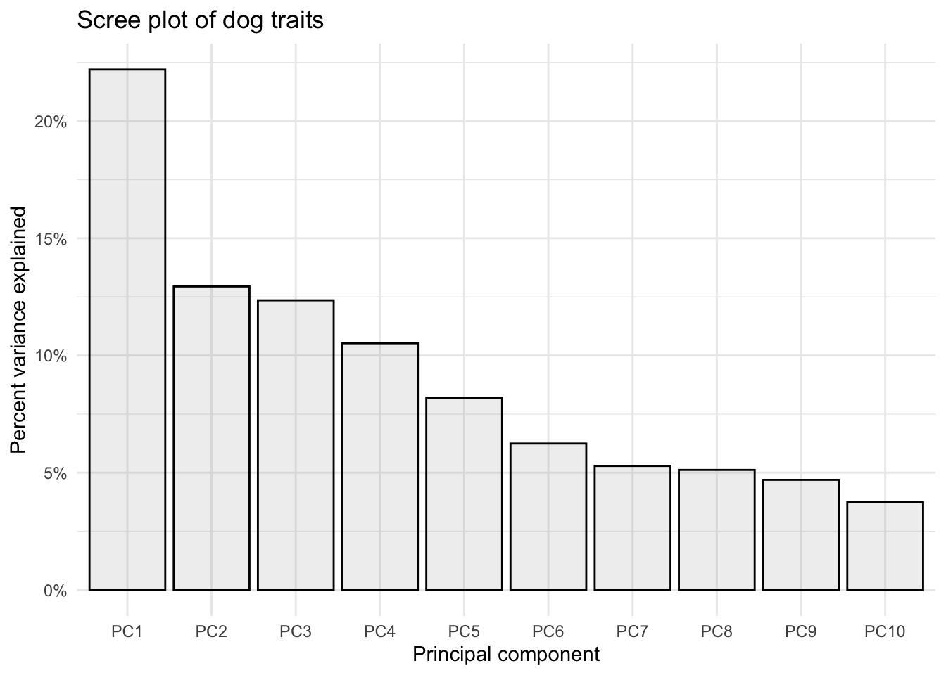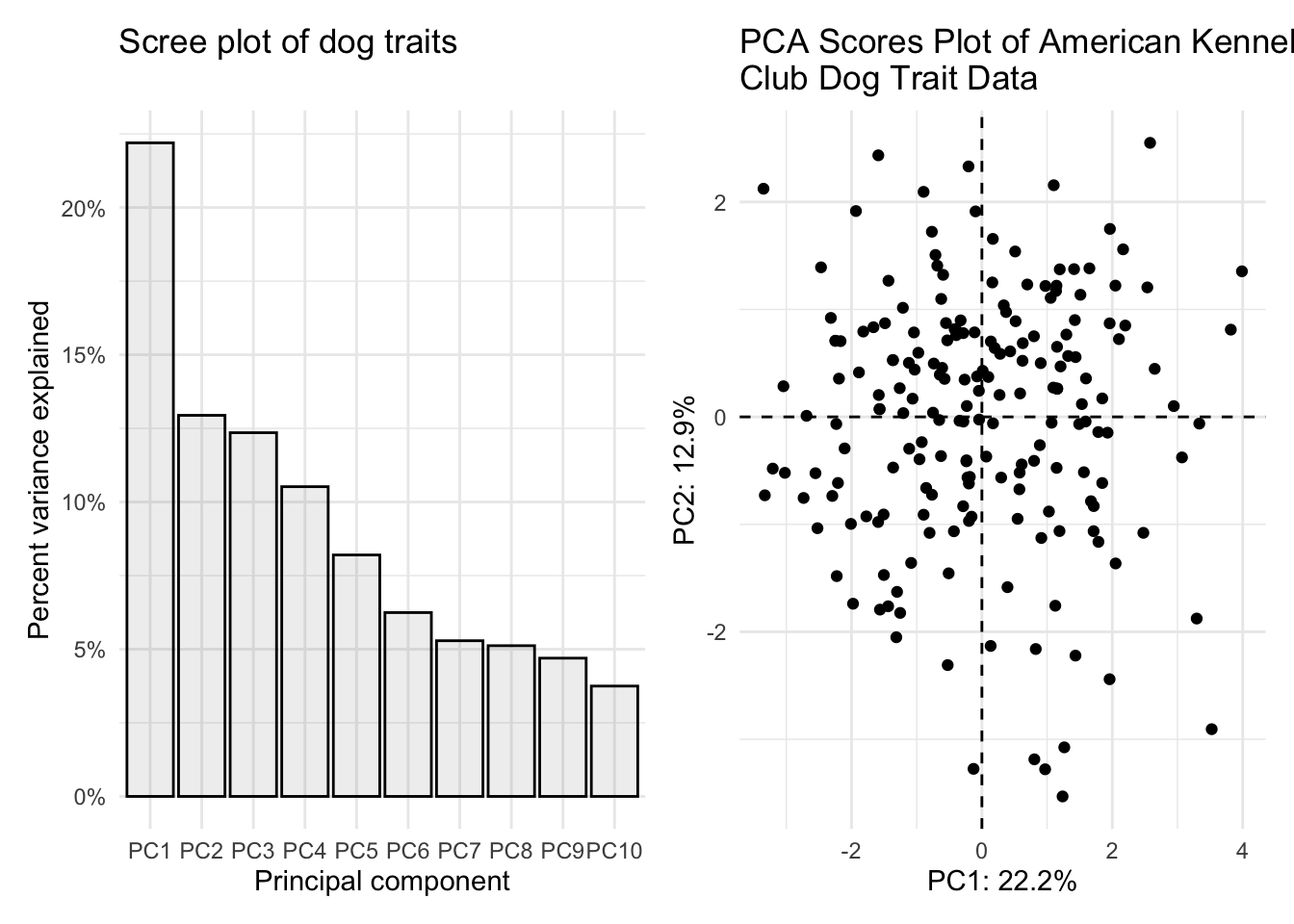 library(gghighlight)1. Principal components analysis (PCA) of American Kennel Club dog bred trait data (6 pts)