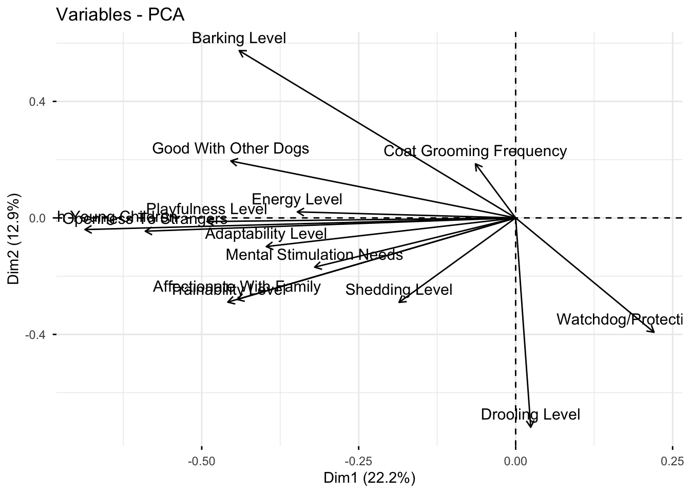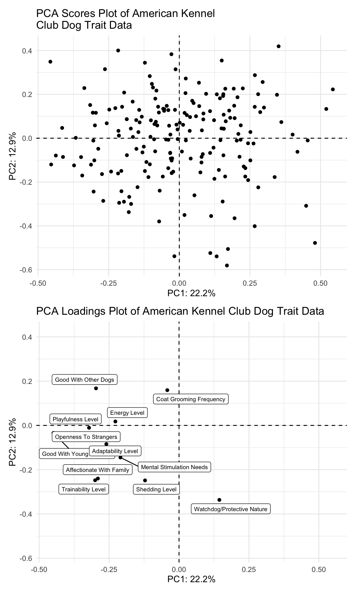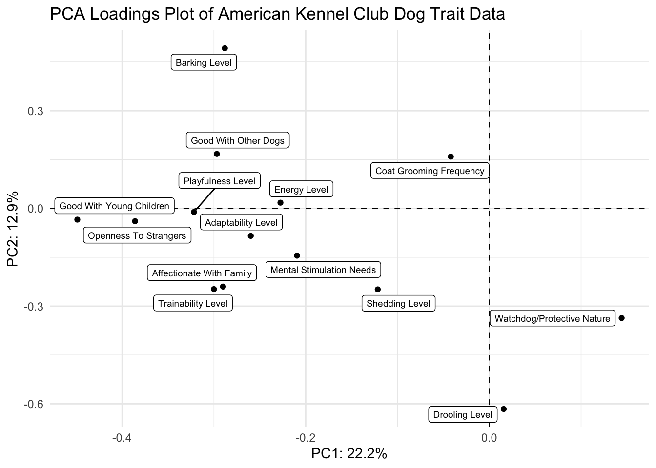 title = "PCA Loadings Plot of American Kennel Club Dog Trait Data"))