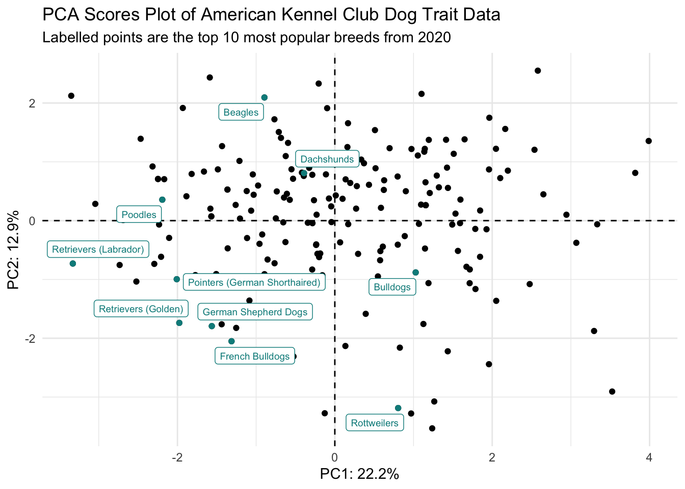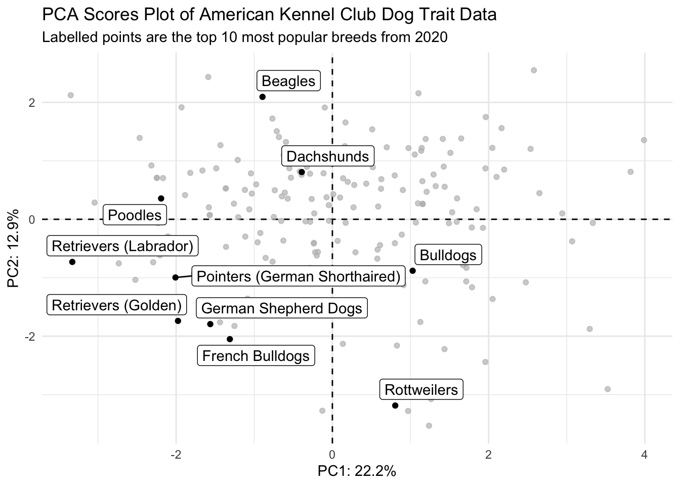 title = "PCA Scores Plot of American Kennel \nClub Dog Trait Data"))