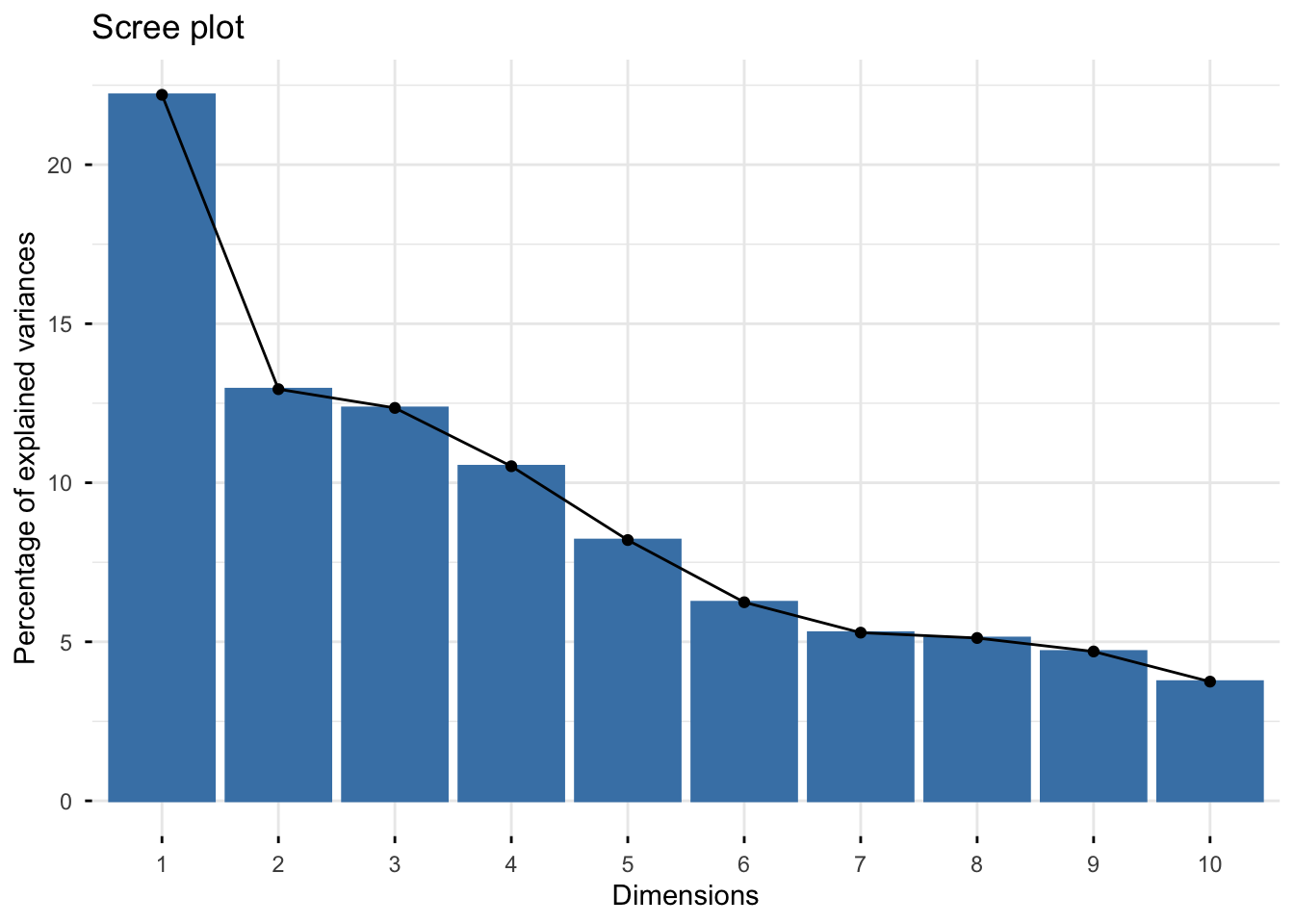 fviz_eig(trait_pca)Warning in geom_bar(stat = "identity", fill = barfill, color = barcolor, :