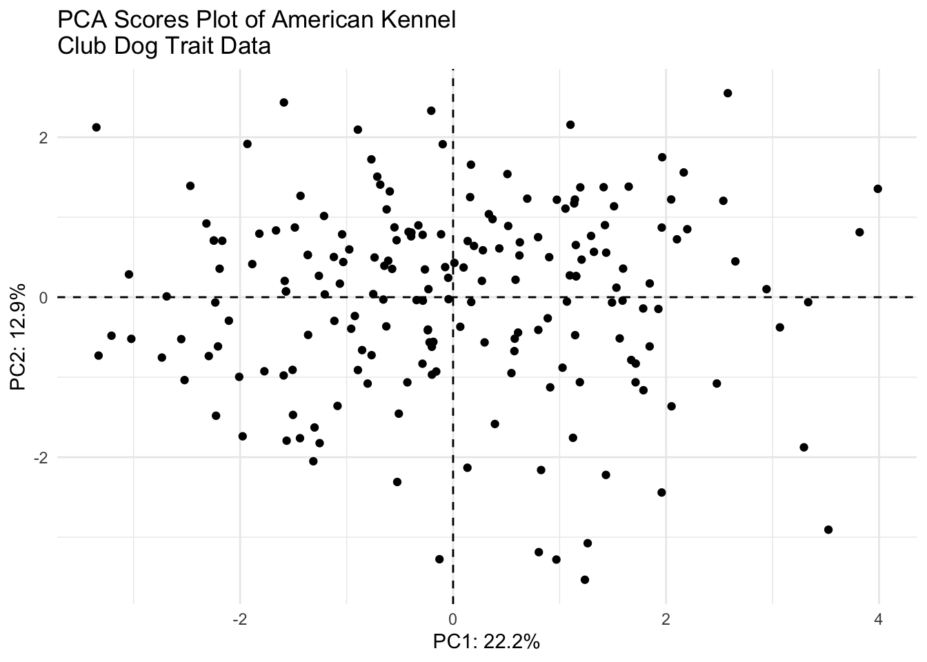 title = "PCA Scores Plot of American Kennel Club Dog Trait Data")