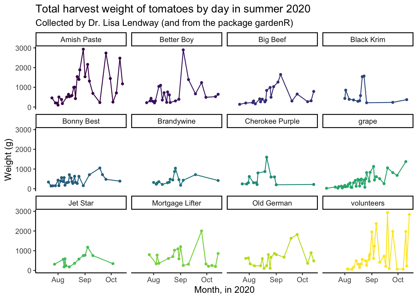 You can see that what R has done is take each date, and plotted the total weight of tomatoes harvested on that day. What we can see from this part is that in the beginning of the season, there is little tomato production (this is not surprising to anyone who knows about horticulture or has grown tomatoes before), and production increases as the season progresses. We donât see any harvest after mid-October which makes sense because Dr. Lendway lives in Minnesota and probably there was a frost that killed the plants (hence no more đ ).