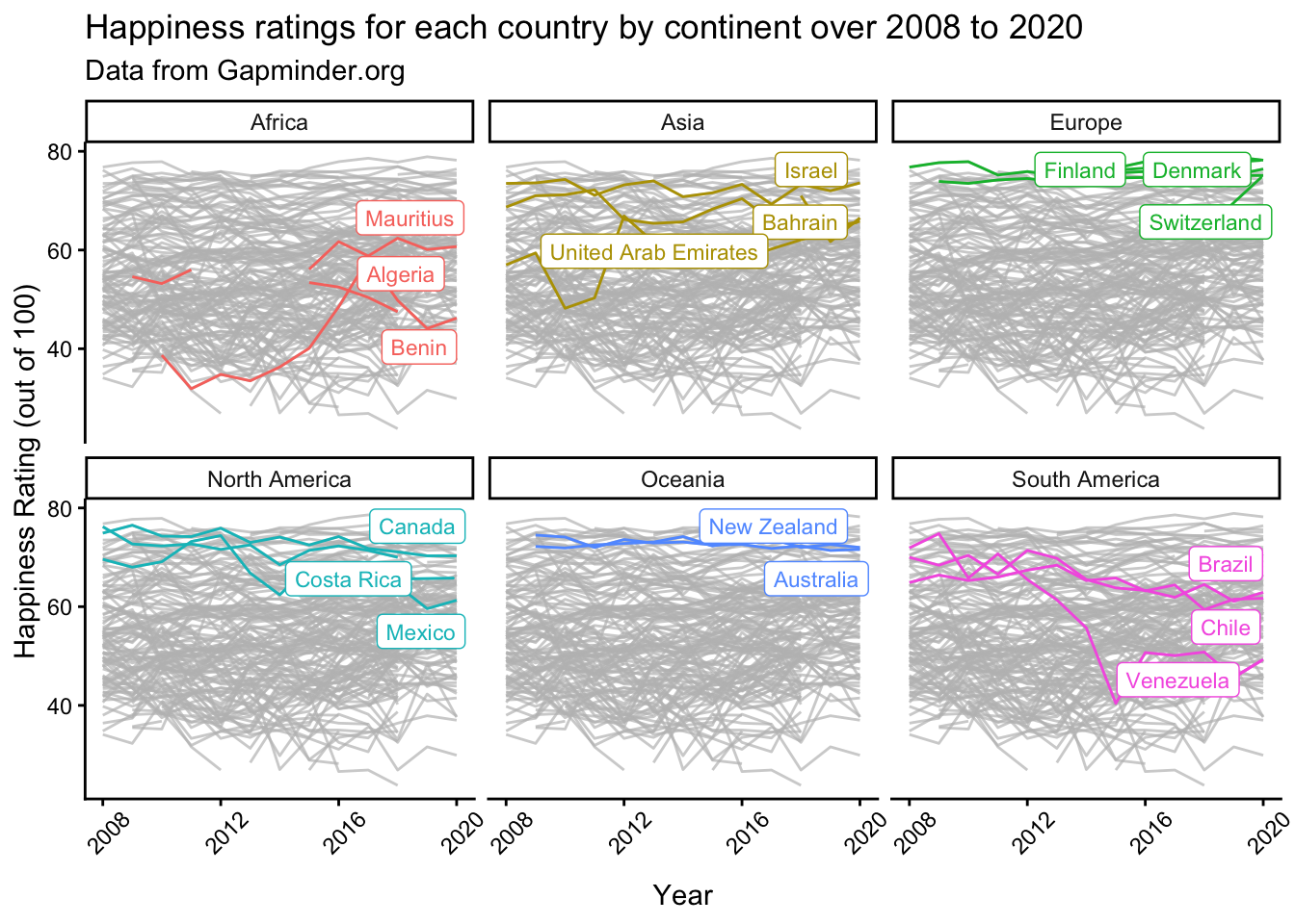 title = "Happiness ratings for each country by continent over 2008 to 2020",